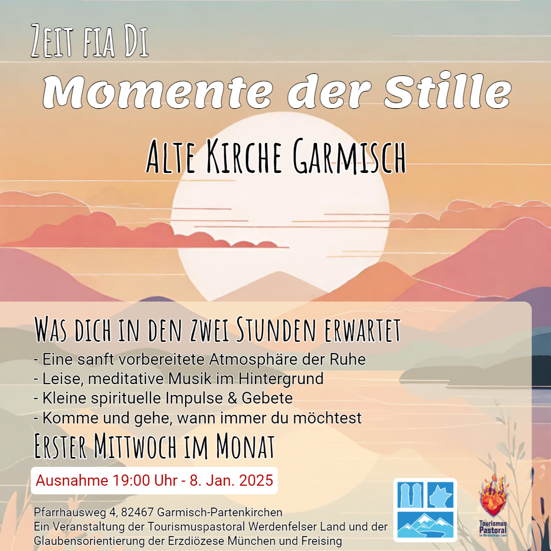 Diese Veranstaltung findet jeden ersten Mittwoch im Monat statt und wird von uns, der Tourismuspastoral Werdenfelser Land und der Glaubensorientierung der Erzdiözese München und Freising organisiert.