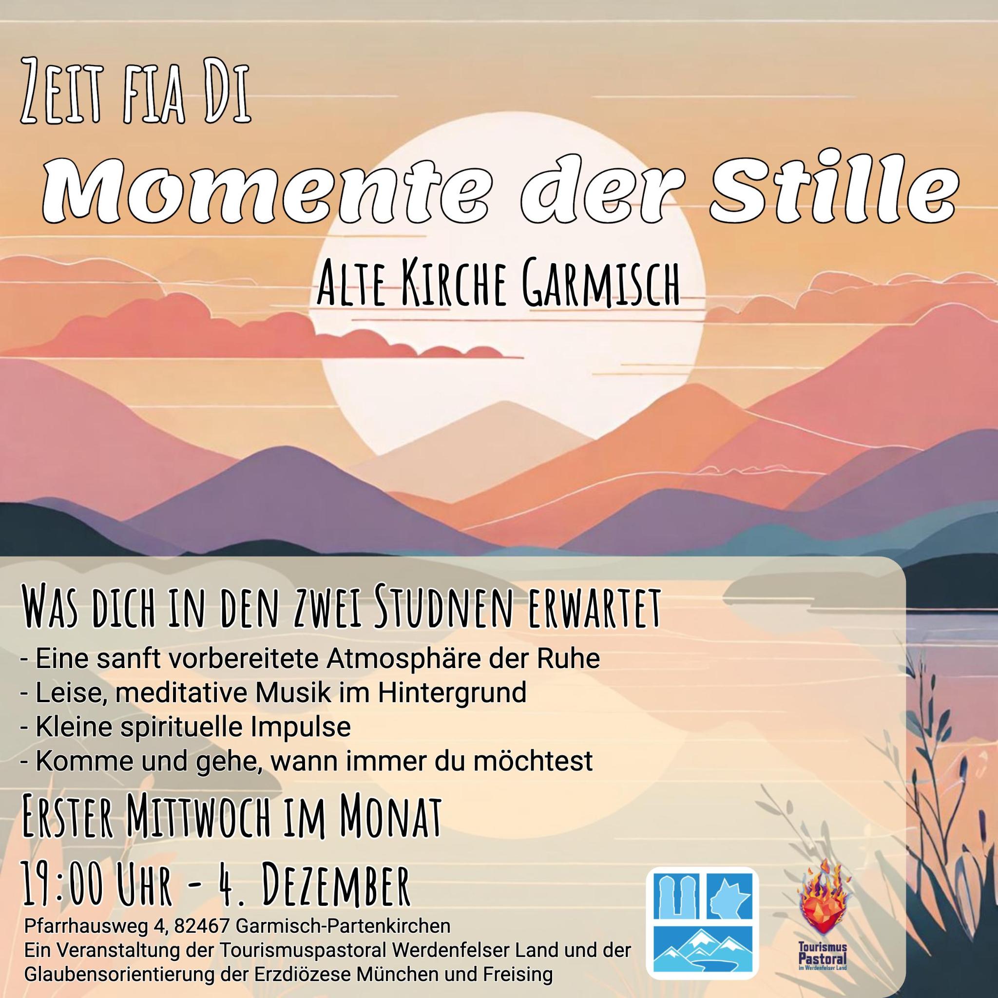"Zeit fia Di - Momente der Stille" findet am 4. Dezember von 19:00 Uhr an in der Alten Kirche Garmisch statt. Dieser Abend bietet Ihnen einen Raum, um zur Ruhe zu kommen und neue Kraft zu schöpfen.