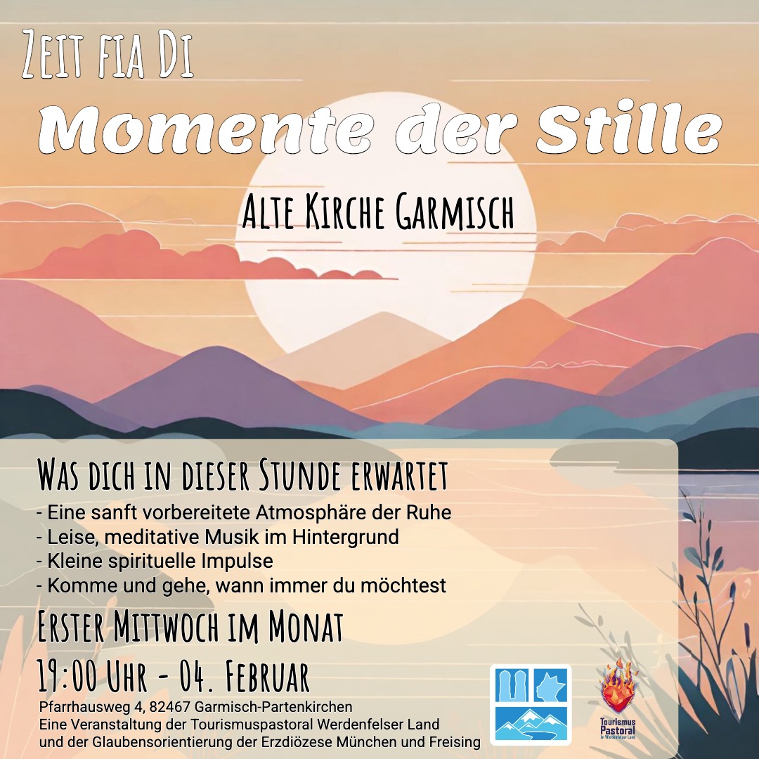 Diese Veranstaltung findet jeden ersten Mittwoch im Monat statt und wird von uns, der Tourismuspastoral Werdenfelser Land und der Glaubensorientierung der Erzdiözese München und Freising organisiert.